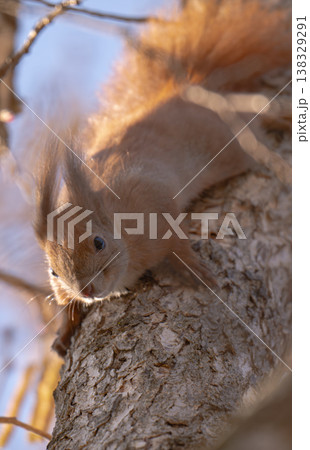 Wild eurasian red squirrel, sciurus vulgaris sitting on a tree. Little fluffy animal