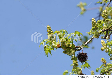 モミジバフウの花と若葉・2025年4月