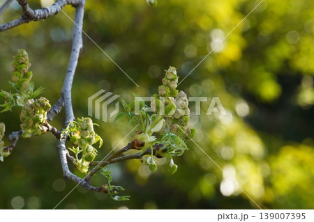 モミジバフウの花と若葉