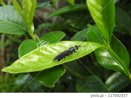 Black soldier fly perched on the leaf. Black Soldier Fly, a species of Soldier flies. Also as known as American Soldier Fly.