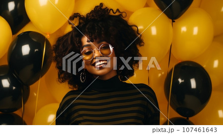 Happy, laughing dark-skinned young girl on a holiday, on a yellow background among yellow