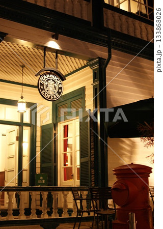 星条旗とともに揺らめくスターバックスのロゴが目を引く夜の外観