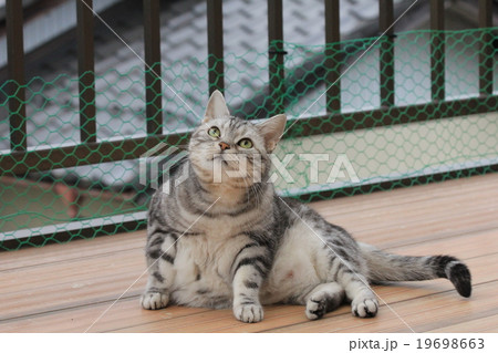 ベランダで横座りをしながら空を見上げるアメリカンショートヘア