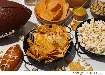 Popcorn and chips with a rugby ball on a light background