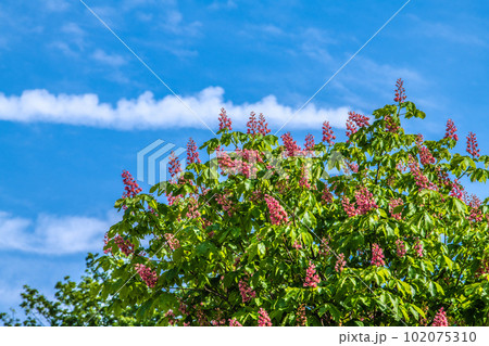 日本の横浜都市景観 ベニバナトチノキ。パリ並木で知られるマロニエとアメリカトチノキとの交雑種=4月