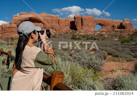Asian female tourist holding camera taking photo of North Window in Arches National Park, Utah, USA