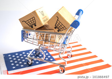 Box with shopping online cart logo and USA America flag, Import Export Shopping online or commerce finance delivery service store product shipping, trade, supplier concept.