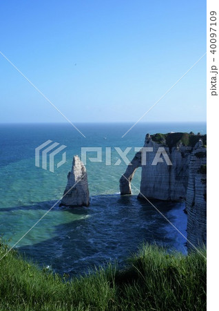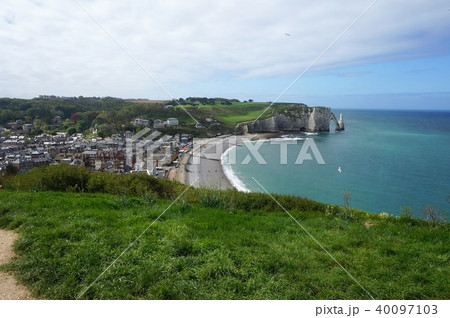 アモンの断崖から見たエトルタの街とアヴァルの断崖