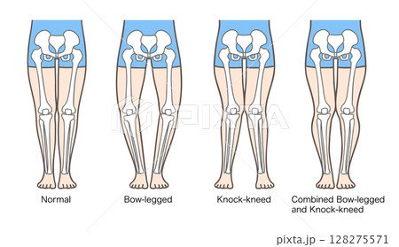 正常な脚、O脚、X脚、XO脚の姿勢とプロポーション