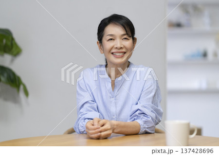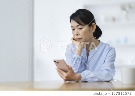 スマートフォンの画面を見る笑顔のアラカンの女性