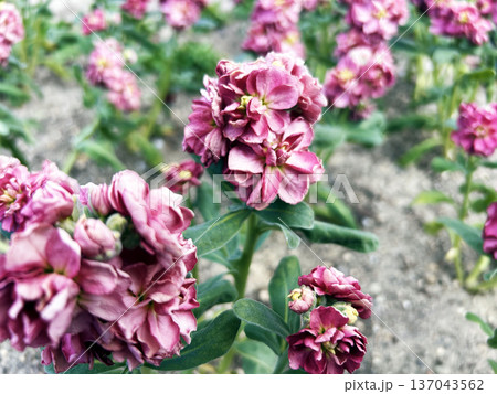 早春の花壇の赤紫のストック