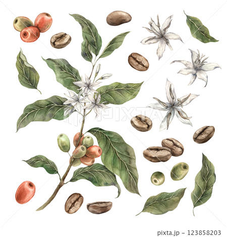 Set of coffee plants with green leaves and red coffee fruits. Ripe berries with white flowers and roasted coffee. Watercolor set of illustrations for shop, cafe, banners, postcards, packaging design