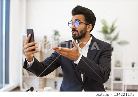 An Arab businessman gestures while speaking on a video call in his office