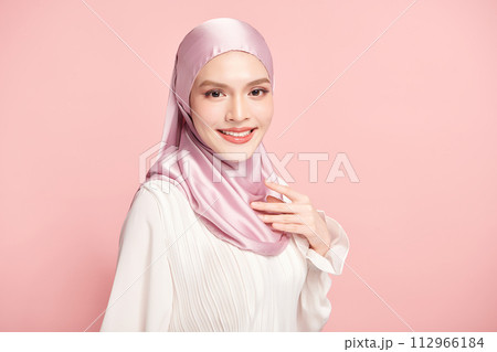 Beautiful young asian muslim woman wearing a pink hijab on pink background, Portrait of Arab Beauty.