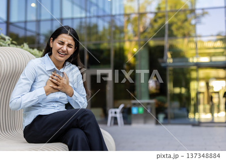 Young businesswoman feeling sudden sharp chest pain or heart attack symptoms, clutching her chest with a distressed expression while sitting on a bench outside an office building