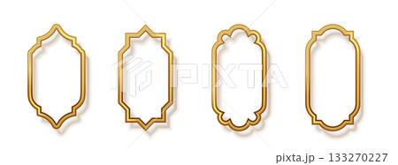 Luxury gold realistic frame. Gold Indian window, oriental seal, stamp, Arabic decorative element. Shining 3d border for awards, certificate, grand opening, greeting card, posters. Vector illustration