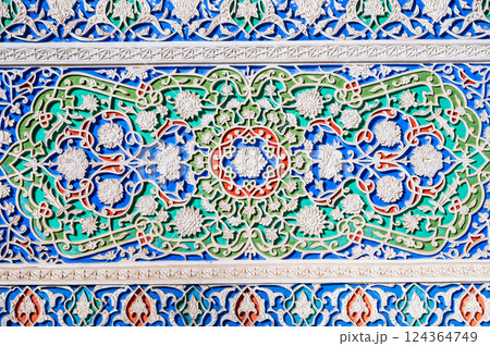 colorful carved wooden painted background with traditional Uzbek ornaments and oriental patterns in Tashkent in Uzbekistan