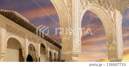 Arches in Islamic (Moorish) style (against the sunset) in Alhambra, Granada, Spain