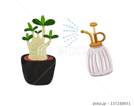 霧吹きミストとアデニウム・アラビカムの鉢植え 水彩風手描きイラスト