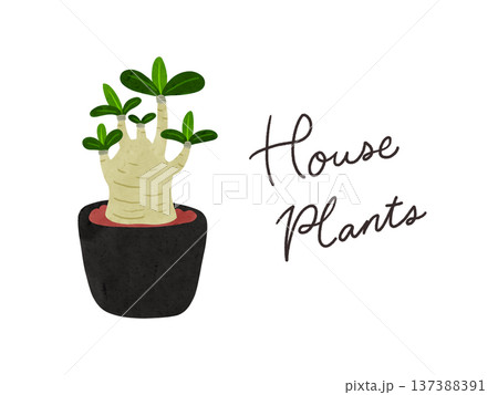 HousePlantsとアデニウム・アラビカムの鉢植え 水彩風手描きイラスト