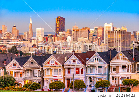The image features the Painted Ladies, colorful Victorian houses, with modern city buildings in the background and Alamo Square Park in the foreground.