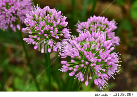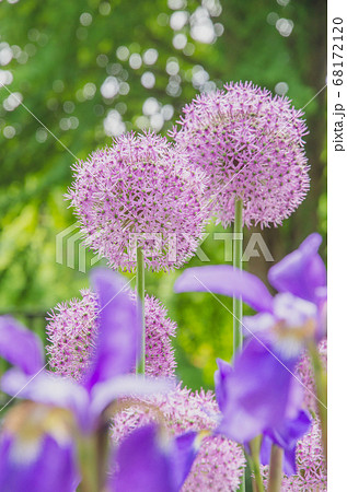 初夏に咲く花、アリウム、ピンク色の丸い花、背景素材
