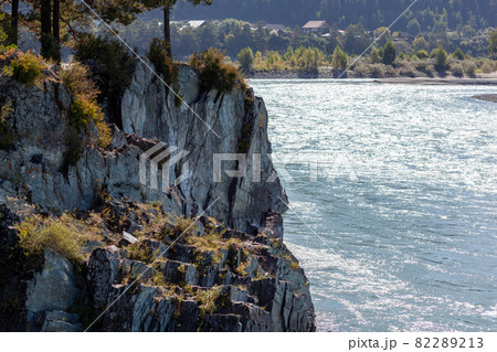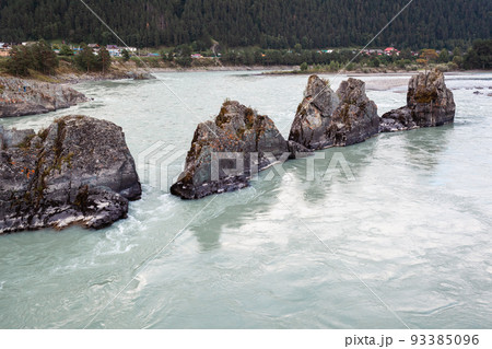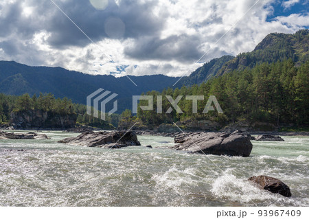 A fast-flowing wide and full-flowing mountain river. Large rocks stick out of the water. Big mountain river Katun, turquoise color, in the Altai Mountains, Altai Republic.