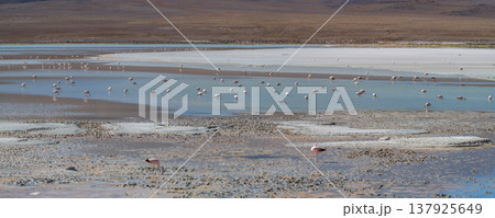 Peaceful flock of pink flamingo in beautiful Laguna Colorada Bolivia