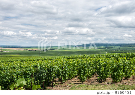 Row vine grape in champagne vineyards at montagne de reims countryside village background, Reims, France