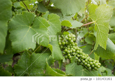 Close up vine green grape in champagne vineyards at montagne de reims countryside village background, Reims, France