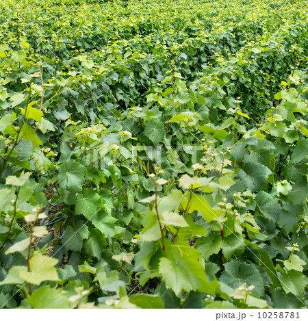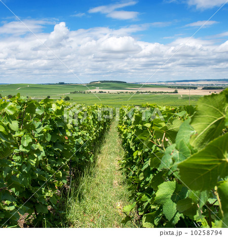 In the Champagne vineyards of Montagne de Reims, Reims, France, row vine grapes.
