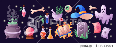 Halloween magic. Witch game. Medieval book. Occult icon. Potion cauldron. Old alchemy bottle. Mystery gravestone. Fantasy tale sorcery. Wizard sticker. Vector garish cartoon witchcraft elements set