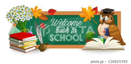 Back to school banner with owl teacher and chalkboard with education supplies, vector background. Welcome back to school chalk writing on chalkboard, chemistry test bottle and ink quill feather pen