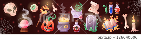 Halloween icon set. Magic witch cartoon isolated objects. Game elements, wizard tale book. Stick of fairy, pot, skull, cauldron with potion. Alchemy bottle. Vector garish sticker witchcraft collection