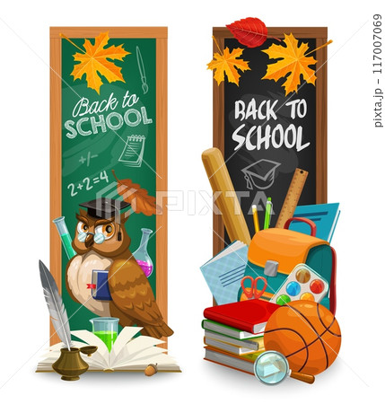 Back to school chalkboard banners with stationery and owl on blackboard, vector education supplies. Back to school with student school bag, lesson books and pens with mathematic formula on chalkboard
