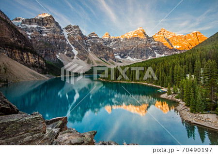 春のカナディアン・ロッキー バンフ国立公園 朝のモレーン湖と新緑(カナダ)