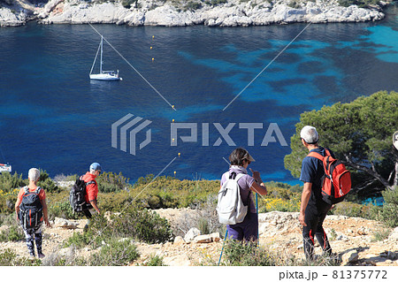 眼下の海を眺めるハイカーの後ろ姿