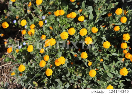 冬の庭に咲くヒメキンセンカ(冬知らず)のオレンジ色の小さい花