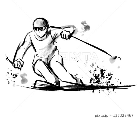 水墨画風のアルペンスキーのイラスト、躍動感のあるウィンタースポーツのイラスト