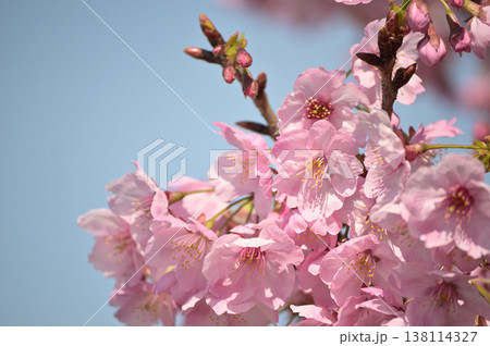 青空に映える淡いピンクの大寒桜(オオカンザクラ)とつぼみ
