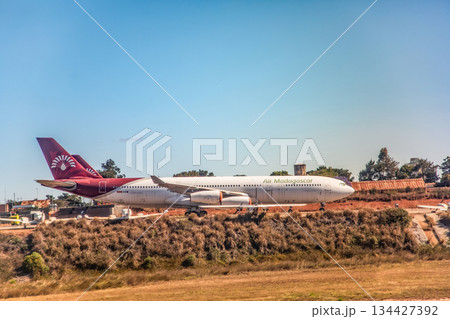 Antananarivo, Madagascar - October 05, 2023: Air Madagascar airplane on runway with clear blue sky backdrop
