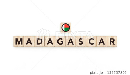 Wooden blocks bearing the name and flag of Madagascar. Malagasy and African Culture, national identity, travel, and geography in a copy space design.