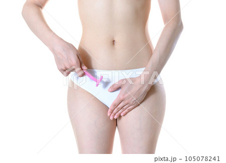 I字カミソリを持つ下着の女性の下半身 ムダ毛処理 ケア 医療美容脱毛 除毛 下腹部 トリミングアップ