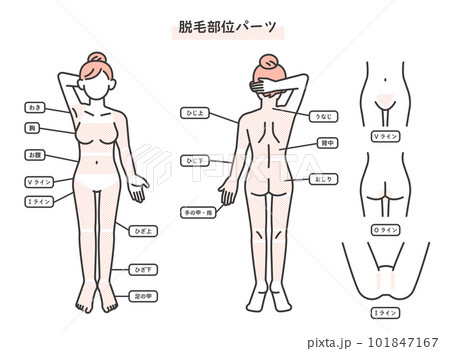 女性の脱毛部位パーツの説明図のベクターイラスト素材/VIO/エステ