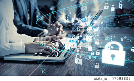 情報セキュリティやサイバーセキュリティのイメージ。セキュリティ対策がなされた安全なシステム。ノートパ