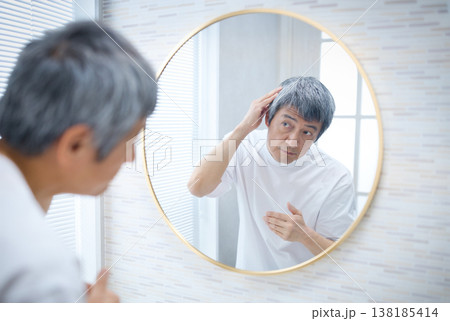 鏡を見て白髪を気にする60代の男性