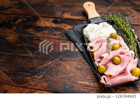 Italian antipasto with Sliced Prosciutto Cotto ham, green olives and mozzarella. wooden background. top view