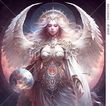 地球を見守る宇宙 女神 天使のイラスト アート(AI生成画像)