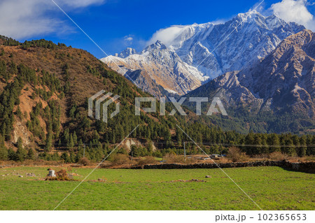 ネパール・ジョムソン街道沿いにある村から見る大河・カリ・ガンダキとニルギリ峰