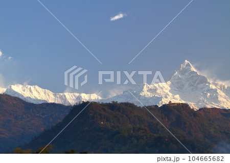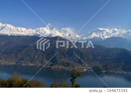 南アジアのネパールポカラ 日本山妙法寺からのヒマラヤ・マチャプチャレとアンナプルナ山群とフェワ湖